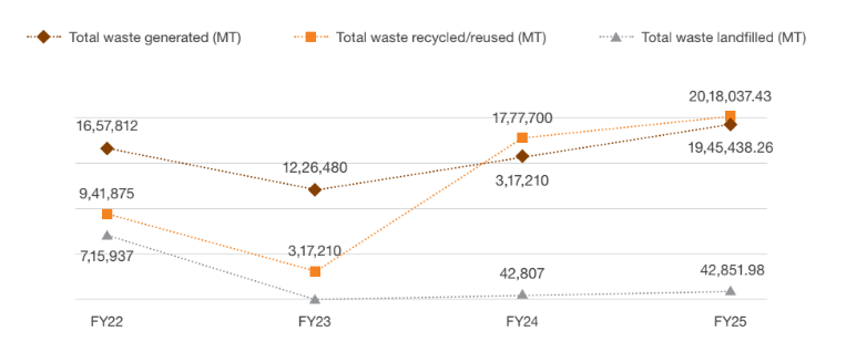 In FY25, the total waste generated amounted to approximately 1.95 million metric tonnes (MT). The volume of waste recycled or reused exceeded the total waste generated, reaching over 2.01 million MT, reflecting the inclusion of legacy waste or carryover from previous years. Meanwhile, waste sent to landfills remained minimal at approximately 42,852 MT of non-hazardous waste at its Jajpur facility, underscoring the company’s continued commitment to sustainable waste management and circular economy practices.