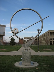 This public stainless steel sculpture by artist Steve Wooldridge stands on a university campus...